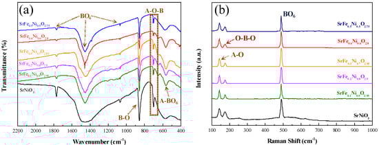 FT-IR (a) and Raman (b) spectra of SrFexNi1−xO3−δ.
