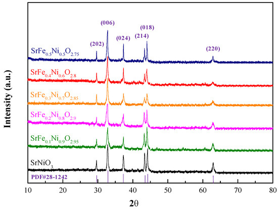 Further refined characterization of SrFexNi1−xO3−δ materials is conducted by XRD analysis in Figure 12. All the XRD diffraction peaks emerging at 29.6°, 32.8°, 37.3°, 44.1°, 43.4°, and 62.9° are sharp and intensive, certifying the brilliant crystallinity of SrFexNi1−xO3−δ materials. Above all, XRD patterns are featured with pure perovskite-type SrNiO3 (PDF#28-1242) and the doping of Fe element does not change the single perovskite phase [43,44], which agrees with the FT-IR and Raman analysis. No diffraction peaks of Fe2O3, Fe3O4, NiO, SrO or other impurities can be observed in the XRD patterns, demonstrating that Fe element is successfully doped into the crystal lattice of perovskite-type structure [45]. According to the results of analysis software (Jade 6.5), the average crystallite sizes are in the range of 432–485 nm for the SrFexNi1−xO3−δ materials. Moreover, the FWHM (full width at half maximum) value for the XRD patterns of SrFexNi1−xO3−δ materials is calculated as 0.332 at the sharpest XRD peak (2θ = 32.8°), which is located in the range (0.1–0.5) of the common crystal material (α-quartz, mica, corundum, diamond, et al.).