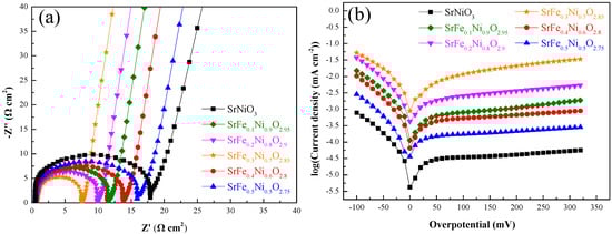 Electrochemical Impedance Spectroscopy (EIS) (a) and Tafel curves (b) of SrFexNi1−xO3−δ.