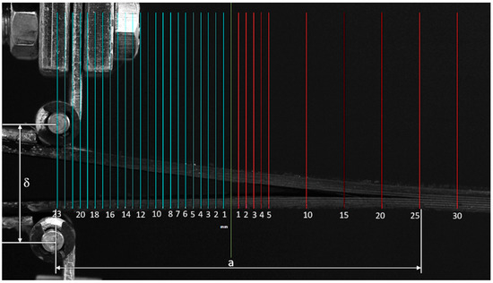 The blue grid reported in Figure 3, whose length is named a0 in the standard calculation, represents the preliminary delamination length included between the pin of the hinge and the end of the non-adhesive insert. The red grid was used for estimating the real crack opening during the test. The total length obtained by combining a0 and the real crack opening is defined as a in all the calculation methods.