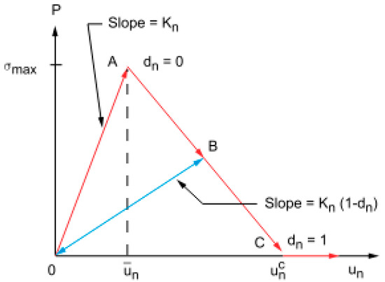 Figure 4 shows linear elastic loading (OA) followed by linear softening (AC). The maximum normal contact stress is achieved at point A. Debonding begins at point A and is completed at point C, when the normal contact stress reaches zero value; any further separation occurs without any normal contact stress. The area under curve OAC represents the energy released due to debonding, and is called critical fracture energy. The slope of the line OA determines the contact gap at the maximum normal contact stress and, hence, it characterizes how the normal contact stress decreases with the contact gap, that is, whether the fracture is brittle or ductile. After debonding is initiated, it is assumed to be cumulative, and any unloading and subsequent reloading occurs in a linear elastic way along line OB at a more gradual slope. Following the ANSYS user’s guide [36], the equation for curve OAC can be written as follows: