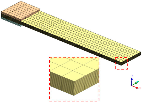 Mesh of the specimen in the numenrical model of the DCB delamination tests.