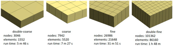 The mesh sensitivity analysis was carried out by considering four kinds of mesh sizes, named “double-fine”, “fine”, “coarse”, and “double-coarse” (Figure 7). The performance comparison is reported in Figure 9. It demonstrates that, from the coarse model on, the results are pretty overlapped. For the calibration in modeFRONTIER, the coarse model was chosen. The analyses were carried out on a workstation esacore with 64 Gb of RAM.