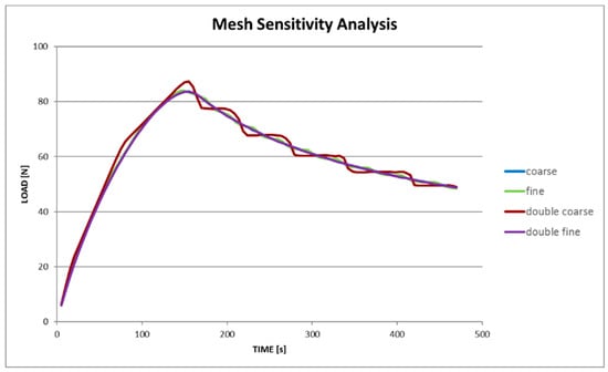 The numerical model was built by means of solid elements (SOLID185 structural elements, CONTA173-TARGE170 contact elements for CZM method usage [36]), one layer of elements for each ply of the composite laminate, in order to guarantee enough accuracy in the calculation of the stress through the thickness of the sample (Figure 7). As far as the size of the mesh in the specimen’s plane is concerned, a mesh sensitivity analysis was carried out in order to find a trade-off between solution reliability and computational time. The aim of the FEA modeling was to calibrate the constitutive model by identifying the set of constants related to the CZM method (e.g. the delamination energy; maximum normal contact stress, also known as cohesive strength). In order to achieve this result, the optimization tool (i.e., modeFRONTIER) needs to compute FE models in a shorter time, because hundreds of runs (managed by the optimization algorhitms) are generally required to get a good fitting with the target curve. The mesh sensitivity analysis showed a behavior quite independent from the in-plane mesh size, because of the fact that both parts of the model (below and upside the delamination plane) had homologous meshes. This means that the positions of the nodes of both parts matched each other, nodes shared by the contact elements on which the CZM method was activated (Figure 8). During the analyses, no convergence issues arose, thus the default settings (L2-Norm) were mantained.