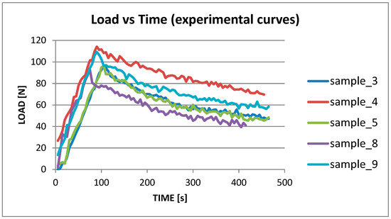 In order to carry out the experimental/numerical calibration of the CZM model, it was necessary to identify idoneous comparison curves (load versus time) among the experimental ones; all the experimental curves were examined, but the tests in which a detachment of the hinges occured were disregarded. In such a way, the number of useful curves was reduced to five (related to specimens’ number 3, 4, 5, 8, and 9), and they are plotted in Figure 11. It can be seen that deformation energy is accumulated in the sample in a load range between 98 N and 115 N. In correspondence with those values, the accumulated energy (GI) reaches the critical value (GIC) so that the delamination starts. After that point, the material response becomes non-linear. The curves related to the samples 3 and 5 are quite overlapped and the related GI energy values are close as well, a bit higher than the average value (about 11%). In Table 1, a synopsis of GI energy values is reported for the different computation approaches [18].
