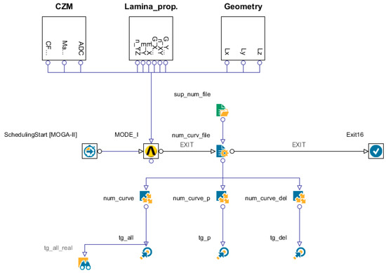 The curve related to specimen number 3 was chosen as a target. To take into account the possible influence of the adhesion force of the teflon insert (representing the initial defect as trigger of delamination), the FEM model was made parametric. The workflow of modeFRONTIER is reported in Figure 12.