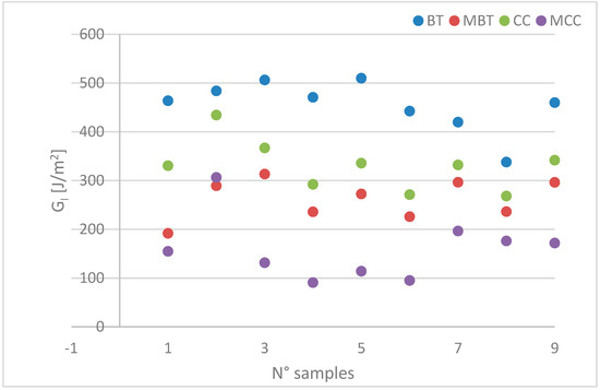 Synoptic of the experimental GI energy values for delamination propagation. BT—beam theory; MBT—modified BT; CC—compliance calibration; MCC—modified CC.