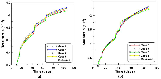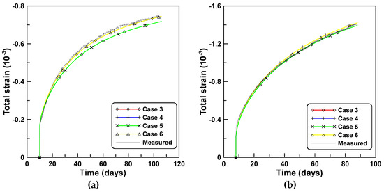 Figure 9a,b compares the total strains predicted by the six constitutive formulations of cases 3, 4, 5, 6, 8, and 9, for the analyses of series A and B, respectively. The total strain of case A is less than that of case B because of the diminished shrinkage strain owing to the lower W/C ratio in case A. It is similar to the total strains of unreinforced cylindrical specimen tests A and B shown in Figure 2. This is because the age-dependent material properties are used for the predictions of time-dependent behaviors of reinforced concrete column as well as the unreinforced specimen, as listed in Table 5.