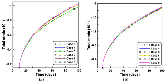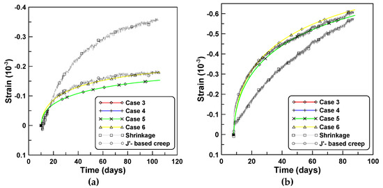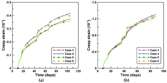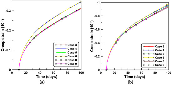 The effects of the time-varying creep concepts and , and the time-varying elastic modulus on the age-dependent behaviors are investigated by comparing the total strains computed for case A shown in Figure 9a. Close agreements are observed for the total strains of cases 3 and 5 and cases 4 and 6 that correspond to the comparison of the cases of the constitutive equations formulated with the same creep concepts and . Conversely, noticeable differences are observed for cases 3 and 4 and cases 5 and 6 that denote the cases used to compare the constitutive equations formulated based on the two creep concepts and , respectively. Close agreement in the total strains is also observed in cases 8 and 9 that were derived with the use of PCM-based and ACM-based creep models, respectively, based on the same creep concept of . The difference in the total strains of cases 3 and 8 and cases 5 and 9 indicate the effects of time-varying elastic modulus on the age-dependent behaviors. Cases 3 and 5 that considered the variations of the elastic modulus with time predict smaller total strains compared to cases 8 and 9. It is also observed that the total strains of cases 4 and 6 are larger than those of cases 3 and 5. Figure 10a,b compare creep strains based on six constitutive equations, and correspond to the total strains of Figure 9, whereby creep strains are obtained by subtracting shrinkage and immediate elastic strain from the total strain. Creep strains based on cases 4 and 6 are larger than those for cases 3 and 5. The latter express a similar tendency to the tendency of the total strain case of Figure 9, whereby the total strains of cases 4 and 6 are larger than those of cases 3 and 5.