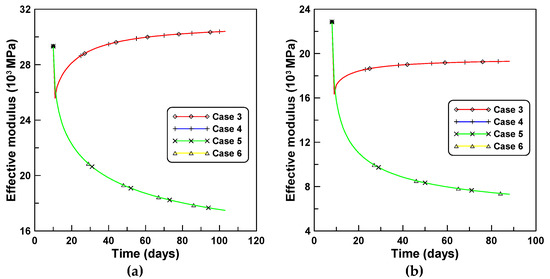 The variations of the effective moduli with time for the four creep models are compared in Figure 6a,b for tests A and B, respectively. The corresponding variations of the elastic moduli as a function of time for cases 3 and 5 are in close agreement with those for cases 4 and 6, respectively. This is because cases 3 and 4, and cases 5 and 6 were derived based on the same creep models of PCM and ACM, respectively, even though the creep concept of was used for cases 3 and 5, and the creep concept of was used for cases 4 and 6. It is understood from this observation that the variation of the effective modulus with time is much more dependent on the type of the creep model rather than the type of the creep concept. Figure 6a,b indicate that age-dependent variations of effective moduli by PCM-based and ACM-based formulations are entirely different, whereby the results associated with the ACM case exponentially decay abruptly one day after the first loading, while the PCM case increases in a manner inverse to that of the ACM case. This is due to the fundamental difference between the PCM-based and ACM-based formulations. The former case is a rate-type formulation used to derive the tangent relation (modulus) between the incremental stress and strain changes within a small time increment, while the latter case is not a real rate-type formulation but rather a semi rate-type formulation, considering the relatively long time interval compared to the former case.