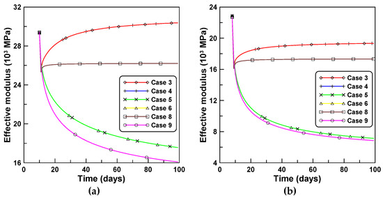 Time-independent analyses were implemented for both analyses A and B to identify the age-dependent effect of concrete on the time-dependent RC column behavior. Accordingly, the concrete stress is plotted in case 10 and compared in Figure 11a,b with concrete stresses elicited by the cases 3, 4, 5, 6, 8, and 9. The concrete stress in the case of time-independent analysis is much larger than the concrete stresses elicited according to the six cases of the constitutive equations listed herein because the restraining effect of reinforcement on the lack of mechanical strain owing to shrinkage and creep induces mechanical stress in the concrete. Figure 12a,b compares the effective moduli of six constitutive formulations for cases A and B, respectively. The variations of the effective moduli with time for cases 3, 4, 5, and 6, show close agreements and similar patterns to those of unreinforced concrete specimens in Figure 6.