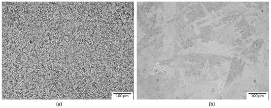 The Ti-6Al-4V alloy in the as-received annealed condition with equiaxial microstructure (a) and after heat treatment to obtain the Widmanstätten-type microstructure (b).