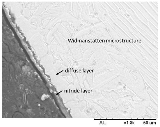 In the scanning electron micrograph shown in Figure 2, the two stages of formation of the nitride layer can be observed. The first stage forms by the interaction between the alloy and the active particles in the nitriding atmosphere, and the second stage forms by diffusion of nitrogen atoms into the bulk of the Ti-6Al-4V alloy [3]. Nitriding of this alloy results in two layers. The first layer is close to the surface and consists of titanium nitrides (Ti2N and TiN), and right below this layer is a region in which nitrogen atoms have diffused in the α phase of the Ti-6Al-4V alloy. Below these two layers, the matrix with a Widmanstätten-type microstructure can be observed. It is also possible to observe that the layers have varying thicknesses, which makes it difficult to measure the thicknesses of the layers. Nevertheless, the thickness of the nitride layer was 3.77 ± 1.46 µm and that of the diffuse layer was 10.37 ± 2.58 µm.