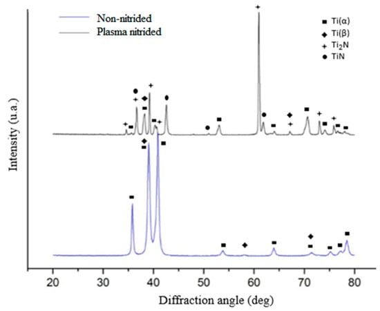 The X-ray diffraction results of the non-nitrided and nitrided Ti-6Al-4V alloy are shown in Figure 3. In the non-nitrided alloy, only two phases could be identified: α phase (JCPDS 44-1294) with hexagonal close-packed (HCP) structure and β phase (JCPDS 44-1288) with body-centered cubic (BCC) structure; these observations are in agreement with other authors [2,3]. In the untreated alloy, three peaks corresponding to reflections from the planes (110), (200), and (211) of the β phase can be observed. However, two of these are coincident with peaks corresponding to reflections from the planes (002) and (103) of the α phase. The only peak of the β phase that does not coincide with peaks of the α phase is the peak corresponding to the reflection from the plane (200), but with low relative intensity. The β phase peak with the highest intensity is that related to the plane (110), and this coincides with the reflection from the plane (002) of the α phase. The coincidence of peaks makes it difficult to identify the β phase in the Ti alloys using only X-ray diffraction when the α phase is also present [13].