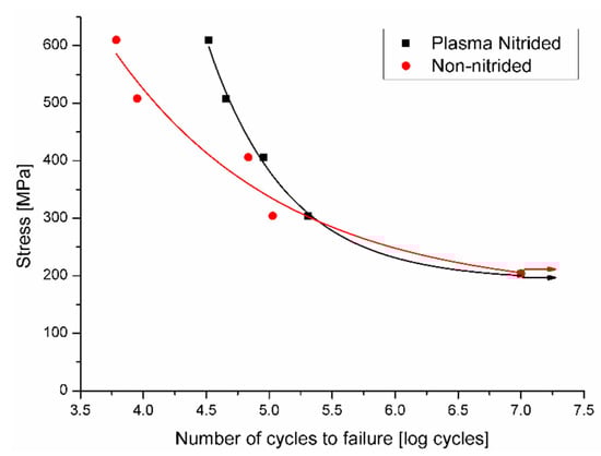 Figure 4 shows the graph S–N curves of the non-nitrided and plasma-nitrided Ti-6Al-4V alloy. At relatively high-stress amplitudes (low cycle fatigue region), this graph shows that the nitrided specimens failed. Overall, in low amplitude stress tests (high cycle fatigue region), no failures occurred until interruption of the tests after 107 cycles (run-out). In general, it can be observed that the nitrided specimens withstood a higher number of cycles than the non-nitrided specimens before failure at higher stress amplitudes and number of cycles lower than 105 cycles. In similar fatigue studies, the same behavior was also observed by Zuo et al. [7]. At high-stress levels, the nitrided specimens withstood a higher number of cycles to failure. At low-stress levels, the behavior of nitrided and non-nitrided conditions were similar.