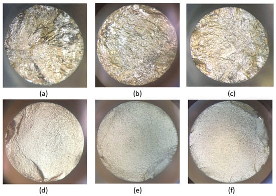 Fracture surfaces of specimens after the tensile test. These images were obtained using a stereoscopic microscope. Conditions: (a) non-nitrided specimen tested at 304 MPa and 123,700 cycles to failure, (b) non-nitrided specimen tested at 406 MPa and 68,700 cycles to failure, (c) non-nitrided specimen tested at 610 MPa and 6700 cycles to failure, (d) nitrided specimen tested at 304 MPa and 233,000 cycles to failure, (e) nitrided specimen tested at 406 MPa and 90,800 cycles to failure, (f) nitrided specimen tested at 610 MPa and 35,000 cycles to failure.