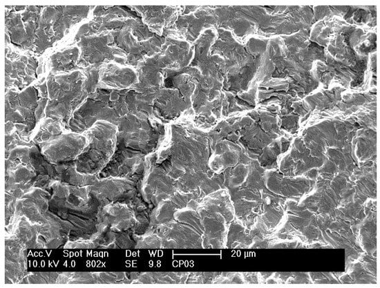 Figure 9 shows a region close to an initiated crack on the fracture surface of a nitrided specimen that was fatigue tested at 610 MPa and 35,000 cycles to failure. These observations are similar to those observed in nitrided specimens that were fatigue tested at other stress cycles. In this region, planar facets and microstructural characteristics of the same size and morphology of a lamella or a colony of lamellas can be observed, similar to those observed on fractured untreated specimens. As reported in other studies [7,27], fatigue crack initiation and propagation in lamellar materials depends on plastic anisotropy of colonies and cleavage fracture. Shear processes parallel to lamellar interfaces are relatively easier than across the lamella. Thus, easy propagation of cracks parallel to lamellar interfaces results in facets on the fracture surface. In contrast, it is possible to observe in Figure 10 on the fracture surface of another specimen (406 MPa and 90,800 cycles to failure) the layers of fractured lamellas caused by microcracks at the α–β interfaces.
