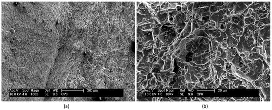 The final rupture region on the fracture surface of a nitrided specimen that was fatigue tested at 406 MPa and 90,800 cycles to failure is shown in Figure 11. In Figure 11a, note the microcavities (dimples) all over the surface, characteristic of a final rupture region caused by mechanical overload. Figure 11b shows Figure 11a at a higher magnification and this reveals in detail the size and morphology of the microcavities (dimples). The microcavities (dimples) are of varying sizes and are predominantly large and shallow, typical of shearing (shear dimples). Throughout the final rupture region, no oval microcavities, typical of tearing (tear dimples), were observed.