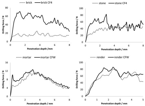 The results of measuring the resistance to abrasion were further confirmed by the DRMS method (Figure 1 and Figure 2). The average drilling force for each consolidated substrate, before and after application of the two consolidants, is presented in Figure 1, while the average forces of three measurements as a function of depth of the substrates before and after the application of the consolidants are shown in Figure 2. The highest increase in average drilling force (related to increase in mechanical strength) was observed in the brick sample after consolidation with silicate-based consolidant; the drilling forces increased from 15.1 N to 46.3 N. A significant increase in average drilling force was also found in the case of the stone substrate: the force increased from 39.0 N to 49.6 N. On the other hand, for the carbonate-based consolidant, smaller increase in force was observed: from 6.9 N to 7.8 N after the consolidation of the mortar substrate and from 52.0 N to 61.7 N after consolidation of the render substrate. Due to the nature of the consolidant, a greater increase in these values was expected for the substrates treated with the silicate consolidant. We found out that there is a close relation between consolidation efficiency of consolidants and porosity of treated substrates. For this reason, the porosity of substrates was thoroughly investigated and these results are described in detail hereafter.