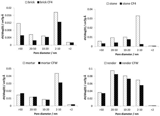 The BET surface area of the substrate consolidated with CF4 was also slightly reduced. As seen from the gas sorption results (Figure 4), the silicate-based consolidant reduced also the pores in the range < 50 nm. A similar trend was observed also for CFW-treated substrates. The decrease in the specific surface area indicates that fine pores were reduced for substrates treated by both consolidants. This is beneficial, as the increase in the fraction of smaller pores is known to raise the susceptibility of porous materials to decay due to the higher pressure caused by salt crystallisation. Consequently, treated materials could be considered as more prone to mechanical deterioration.