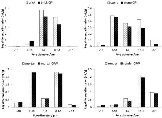 The silicate-based consolidant (CF4) reduced the porosity of the treated substrates (decrease in porosity after treatment was from 44.2% to 40.2% and from 12.3% to 9.8% for brick and stone substrates, respectively—Table 3), indicating that the consolidant caused a partial closing of the pores in the substrates. In terms of pore-size distribution (Figure 3), CF4 resulted in a decrease in the percentage of pores, which is especially evident for the stone substrate. In the case of brick, a slight increase in pores with radius 2–10 μm was observed, probably due to the merging of some mesopores into macropores. The modification of the pore system of the substrate with CFW was much less. The porosity of the substrates treated with the carbonate-based consolidant did not change significantly and remained constant before and after treatment (Table 3). However, the deposition of the consolidant into the pores resulted in a slight decrease in pores smaller than 2 μm (ranges 1–2 μm, 0.1–1 μm, < 0.1 μm), which is observed in the case of both substrates treated with CFW. On the other hand, in the ranges 2–10 μm and > 10 μm, a slight increase in pores was observed.