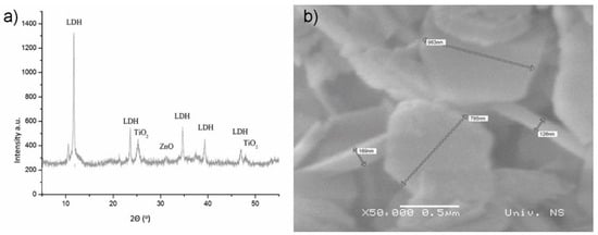 Based on the XRD results shown in Figure 5a, the presence of the layered double hydroxide crystal structure (LDH) and titania was identified in the newly developed photocatalytic coating. The presence of ZnO phase was also confirmed by XRD analysis. The successful synthesis of the LDH material was additionally confirmed by the analysis of its morphology (SEM analysis, Figure 5b). The presence of the typical hexagonal plate-like particles was identified.