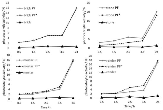 In order to assess the stability of the photocatalytic coating to fluctuations of temperature, the values of activity of the photocatalytic coating were examined after freezing–thawing cycles (Figure 7). In the case of brick substrates, due to the presence of carbonate grains, some deterioration in the bulk of the substrates was identified, although the photocatalytic coating showed no significant changes (Figure 7). In the case of the mortar substrates, the cycles of freezing and thawing had a small but positive effect on the photocatalytic activity: an increase in this value was identified, probably as a consequence of the TiO2/LDH structure opening due to additional TiO2 action. Regarding the photocatalytic activity assessment of the stone and render substrates, no changes in photocatalytic activity were identified. Evidently, it can be concluded that the applied coating is sufficiently durable under the freezing–thawing cycles used.
