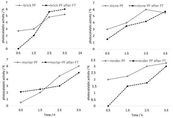 Photocatalytic activity of the treated mineral substrates before (PF) and after the freezing–thawing procedure (PF after FT).