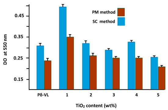 The effect of virgin polymer and hybrid material prepared by the two routes on LoVo cells was examined by the MTT assay described in the literature [53,54]. Accordingly, in plates containing six wells, 3 × 105 cells (LoVo cells) were seeded and then exposed for 24 h at different concentrations of pure Pδ-VL and Pδ-VL/TiO2 nanocomposites. The culture medium thus prepared was then replaced by another containing 5 mg·mL−1 of MTT in PBS at a level of 10 volume % of the total volume of the culture and then incubated for 3 h at 37 °C. The produced formazan was then dissolved in 1.0 mL of a solution containing 0.1% by volume of isopropanol/hydrochloric acid mixture. Aliquot of 200 μL of the supernatant was then placed in a 96-well plate and the absorbance was recorded on an xMark Microplate Spectrophotometer (Bio-Rad, Hercules, CA, USA) at a wavelength of 550 nm. All experiments were performed using different positive controls for adhesion such as TCP (Do at 550 nm was 0.24) and a collagen-treated surface as well as non-adhesive surfaces as a negative control.