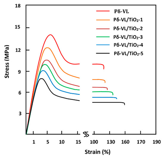 Typical stress–strain curve for pure Pδ-VL and Pδ-VL/TiO2 films, prepared by the SC method, undergoing tensile strain testing.