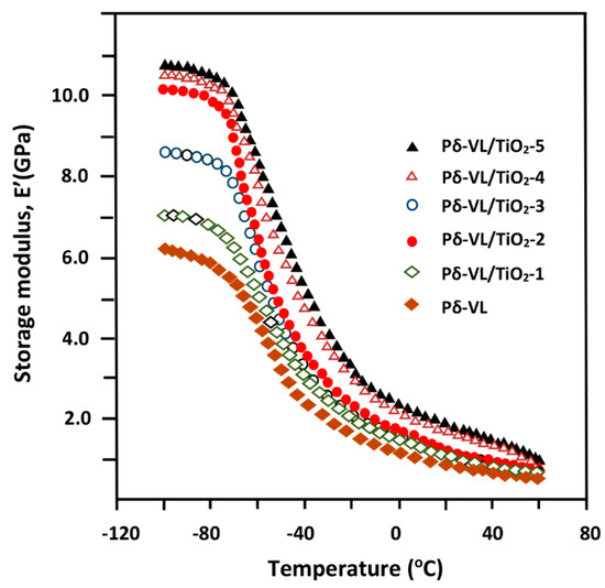 Variation of the storage modulus, E′, versus temperature for virgin Pδ-VL and Pδ-VL/TiO2 nanocomposites containing different TiO2 loads prepared by solvent casting method.