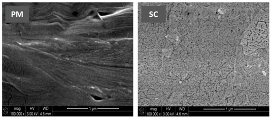 SEM micrographs of surface morphology of Pδ-VL/TiO2-1 hybrid material prepared differently: PM: prepared by polymer melting; SC: prepared by solvent casting.