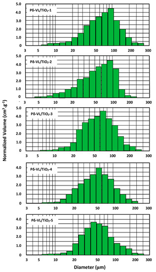 The structure of the scaffolds must be porous and the pores interconnected in order to facilitate the circulation of fluids transporting oxygen and nutrients from the cells. The porosity of the scaffolds determined by the pychnometer method are shown in Table 3. These values indicate an average porosity for the specimen containing 1 wt % of TiO2 samples with a value of 78.23%. For the sample containing 1 wt % of TiO2 and decreasing slightly with the increase of titanium oxide in the composite. This finding is probably related to the mechanical and thermal properties of the material. For example, the elongation at break and the Tg values increased when the TiO2 content in the Pδ-VL/TiO2 material increased. In this sense the material becomes more and more flexible favoring a shrinkage of the pores due to the action of the high vacuum created during the formation of interconnected pores process. The data of the pore size distribution in the obtained Pδ-VL/TiO2 hybrid materials are illustrated in Figure 10. As can be seen from these values, all specimens showed a wide pore size distribution in which the top is localized between 30 and 100 μm depending on the TiO2 loaded in the composite. The presence of very small pores (<5 μm) can be a proof of the interconnection of the pores. In general, as shown in this figure the distribution of pores sizes is ranged between 4 and 270 μm. This result confirms clearly the presence of a high percentage of interconnected pores.