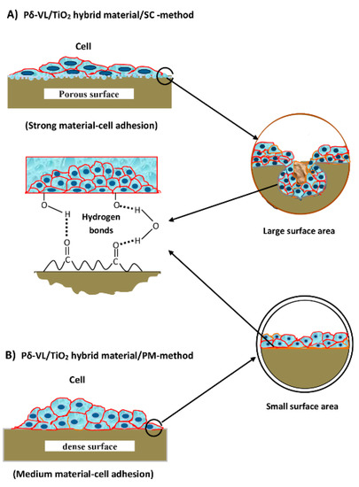 Comparative scheme of cell adhesion on Pδ-VL/TiO2 hybrid prepared differently: (A) SC-method (prepared by polymer melting); (B) PM-method (prepared by solvent casting).