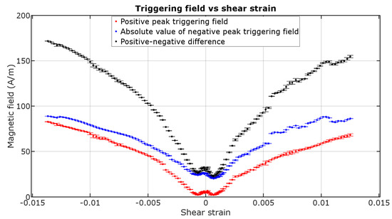 Figure 5 presents the triggering field in function of shear strain of the sample. The dissimilarity between the negative and positive peak values are caused by the non-zero earth’s magnetic field (~10 to 30 A/m in one axis), which was not controlled for in this experiment.