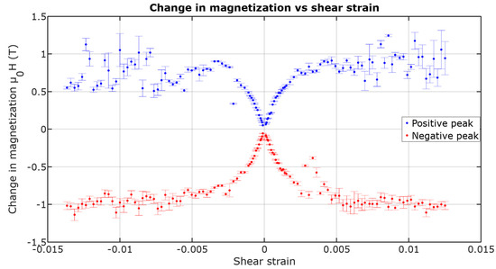 Following Equation (2), by integrating only the ME voltage peaks, a plot describing change in magnetization caused by shear strain during each magnetization change was presented in Figure 7. Note that the integrated signal for each measurement was taken from a single plot, not from a plot averaged from 20 cycles.