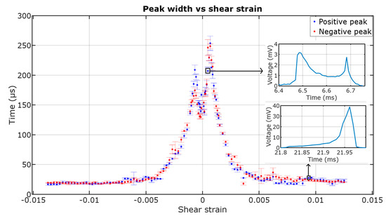 Dependence of the ME peaks’ width on shear strain (±1 std. deviation, insets show the voltage signal vs. time plot for two exemplary points—low shear strain and high shear strain region).