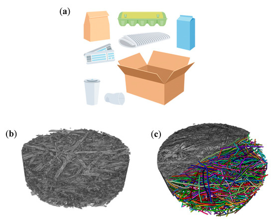 (a) Example of fiber-based product, (b) micro-tomography of fiber network, and (c) fiber network schematic reconstruction.