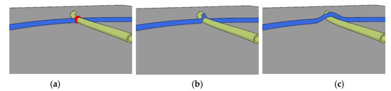 Figure 2. Steps in deposition procedure: (a) finding intersections with previously deposited fibers, (b) lifting the intersection point, and (c) smoothing the fiber. - The found intersection points are lifted discretely to exclude penetration (Figure 2b). The contact search diameter depicted in the figure corresponds to the height of the fiber, which is smaller or equal to the width of the fiber normally.