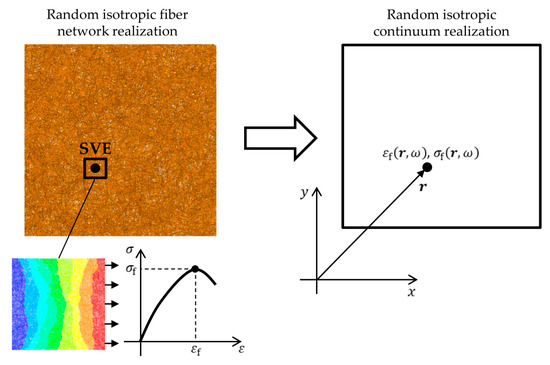 The aim of this work is to model computationally expensive random isotropic 3D-fiber network realizations by statistically equivalent random continuum realizations, see Figure 4. The model is based on the random spatial fields of strain to failure and strength which are found using direct mechanical simulation on SVEs. The latter is defined as the ratio of the applied force on the SVE and the average thickness of the whole fiber network. The characterization and reconstruction of the random spatial fields as well as the stochastic constitutive model used to predict the mechanical response of isotropic fiber networks of arbitrary size, is presented in Section 3.2, Section 3.3, Section 3.4 and Section 3.5.
