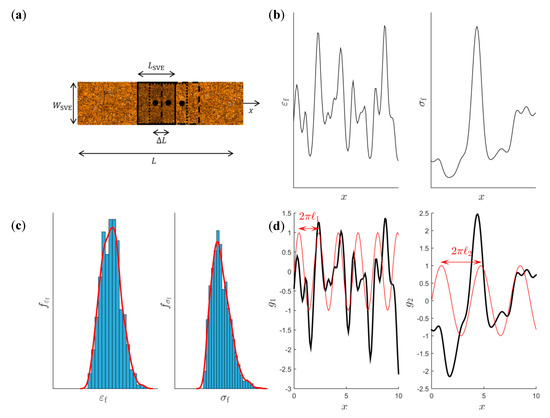 where and are the cumulative density functions (CDFs) found by integration of the kernel density estimators according to Equation (10), and is the standard normal CDF. In Figure 5d), these Gaussian random fields are schematically shown. An important characteristic of each of these one-dimensional Gaussian fields is the average distance between two zero level up-crossings denoted by [38]. These are computed based on the number of up-crossings in the interval [0, ] corresponding to the specimen length in Figure 5a, defined as