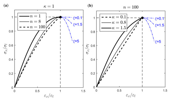 Effect on the stress–strain relation of (a) damage exponent and (b) parameter in Equation (23).
