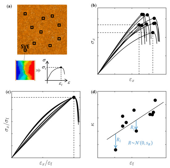 is assumed, where and are found by least squares fit for SVEs of the same size and the residual error is assumed to follow a normal distribution with a standard deviation computed from the residual fitting errors , see Figure 7d. The last term in Equation (27) ensures that the elastic modulus according to Equation (25) is not solely dependent on and but involves an additional random component. The uncertainty can be seen as an epistemic model error, resulting from the assumption according to Equation (27).