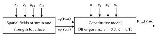 From Figure 6b, it is apparent that increasing the parameter , for a constant (i.e., constant SVE size), also corresponds to an increasing elastic and plastic work in a uniaxial test. It is therefore clear that larger values are typical for responses characterized by larger strain to failure values. This leads to the assumption , see Figure 7d and Section 4.1. A stochastic relation of the form