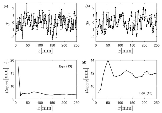 The resulting normalized spatial fields and , computed using the kernel approximation of the PDFs, are shown in Figure 11a,b. In Figure 11c,d, the average distance between two zero level up-crossings was computed for an increasing number of points along the length of the specimen. As can be seen, a specimen length of mm was necessary for convergence to mm and mm. The initial guesses mm, mm, and can therefore be computed.