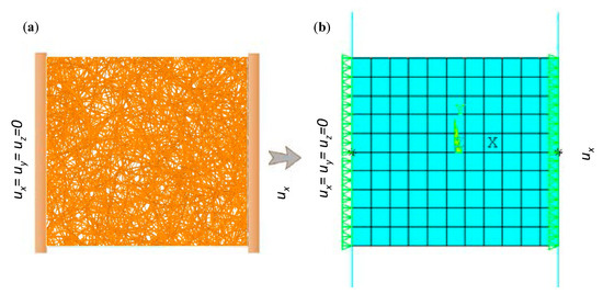 Finite element model and boundary conditions of a uniaxial test using (a) direct fiber simulation and (b) proposed continuum model.