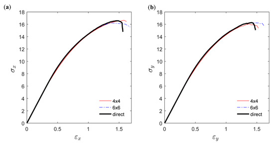 In Figure 14a, the uniaxial response in the x-direction using the continuum model is shown together with the response from the direct simulation. The results for both SVE sizes are in good agreement with direct simulation, with an absolute relative error in strength to failure of 0.4% and −2% for the 4 × 4 mm2 and 6 × 6 mm2 SVE size, respectively. The corresponding errors in strain to failure, 6% and −6%, are, however, larger. In Figure 14b, the responses are also compared for an applied load in the transverse y-direction, with an overall performance similar to the x-direction.