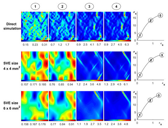Spatial distribution of uniaxial strain with increased loading for: direct simulation, continuum model with SVE size 4 × 4 mm2, and continuum model with SVE size 6 × 6 mm2.