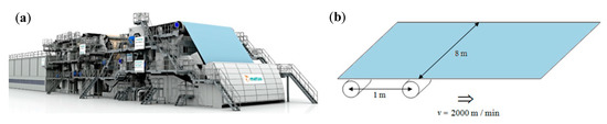 (a) Paper machine during the paper-making process. (b) Paperboard with rollers placed 1-m apart.
