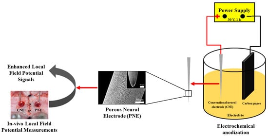 Stainless steel needles (6 cm length and 0.3 mm diameter, Dong Bang Medical Inc., Seongnam-si, Korea) were used as conventional neural electrodes (CNE); porous neural electrodes were fabricated by electrochemical anodization of CNEs. Ammonium fluoride salt (NH4F, 98.0%), for electrolyte preparation was obtained from Daejung Chemicals and Metals Co., Ltd., Shieung-si, Korea, and ethylene glycol (Extra pure, >99.0%) as an electrolyte solvent was obtained from Alfa Aesar, Incheon, Korea. All the materials and reagents were used as received without any further modification.